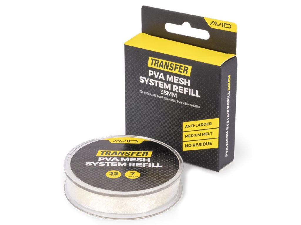 Transfer PVA Mesh Refill jsou náhradní PVA punčocha o délce 7 metrů, určená k doplnění našeho Transfer PVA Mesh Systemu, zároveň je plně kompatibilní se všemi PVA systémy na trhu o průměru 25 mm nebo 35 mm (dle zvolené varianty).